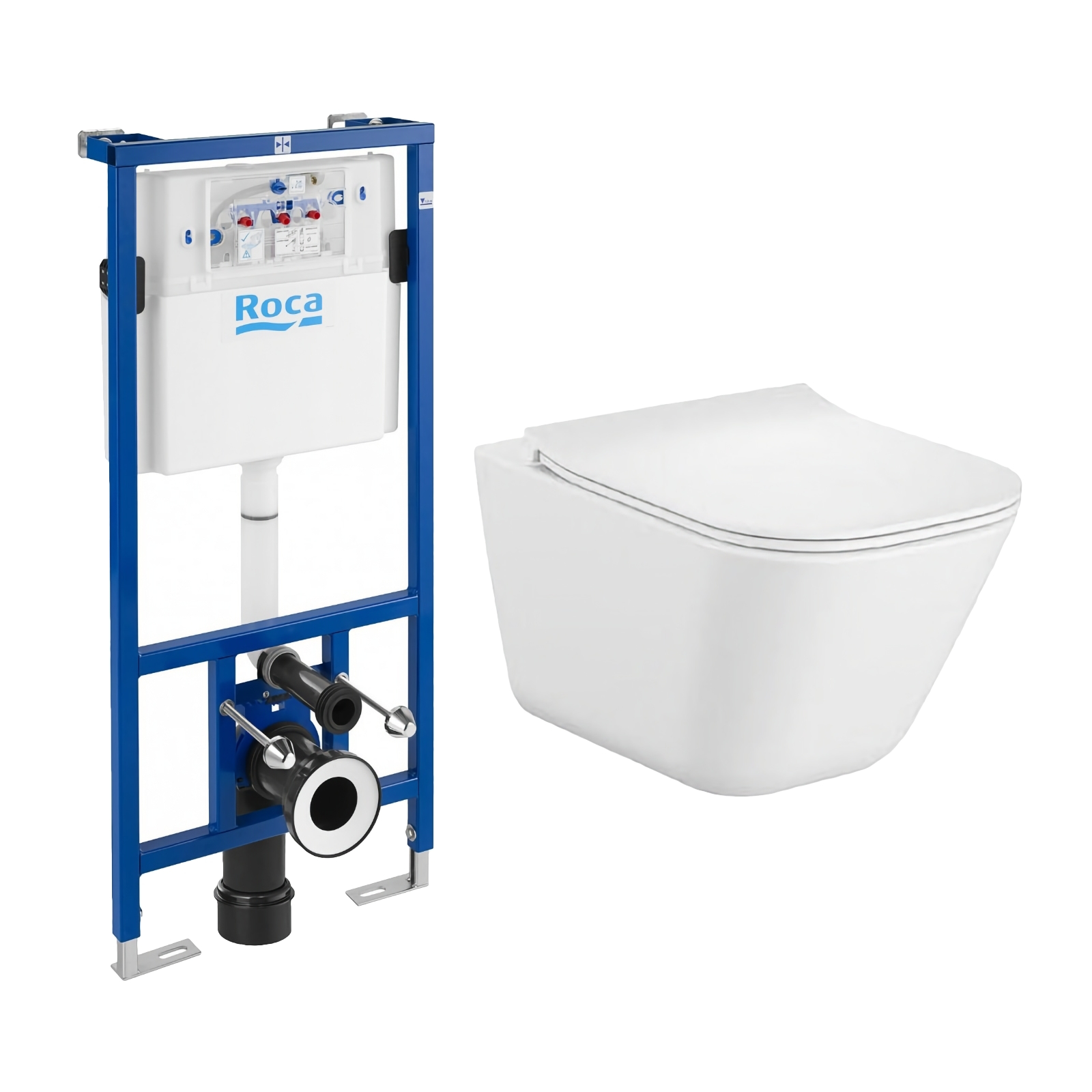 Pachet WC The Gap Square Rimless prinderi complet ascunse Roca este solutia ideala pentru un spatiu sanitar modern, igienic si elegant. Pachetul contine toate elementele necesare pentru montaj: rama cu rezervor incastrat, vas WC suspendat Rimless cu prinderi complet ascunse si capac slim cu inchidere lenta, fabricat din duroplast antibacterian ultra-rezistent. Face parte din colectia The Gap semnata de designerul Antonio Bullo, recunoscuta pentru liniile contemporane si functionalitatea sporita.